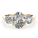 A yellow gold engagement ring setting featuring an oval center diamond flanked by two round side diamonds in a classic four claw setting Brisbane