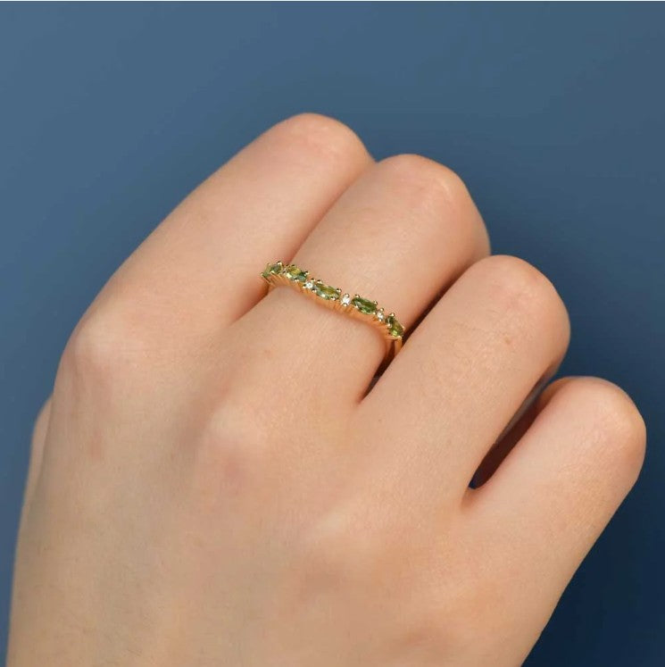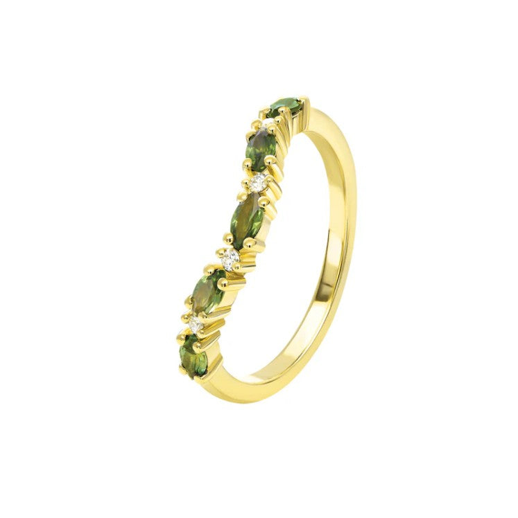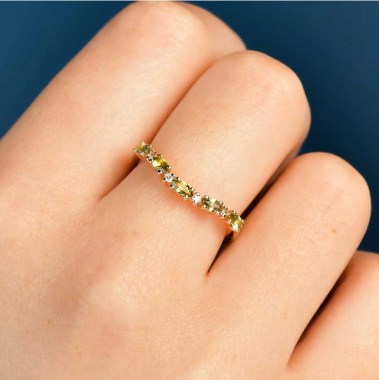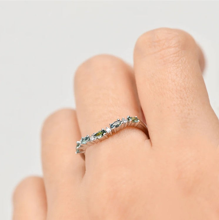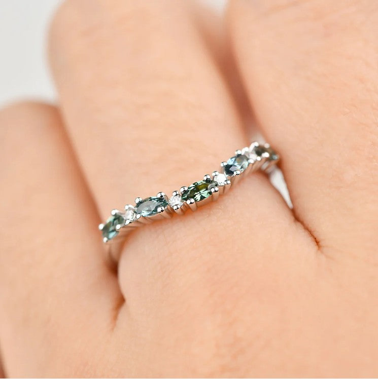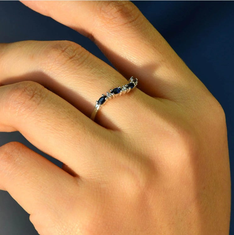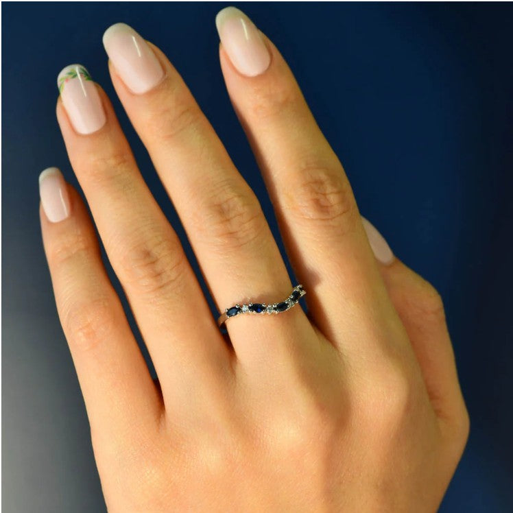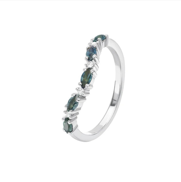 The Georgia sapphire ring is the perfect pairing for any engagement ring or stylish pop of colour to wear by itself, this curved band features interchanging diamonds and Australian marquise blue sapphires and a great addition to any outfit.