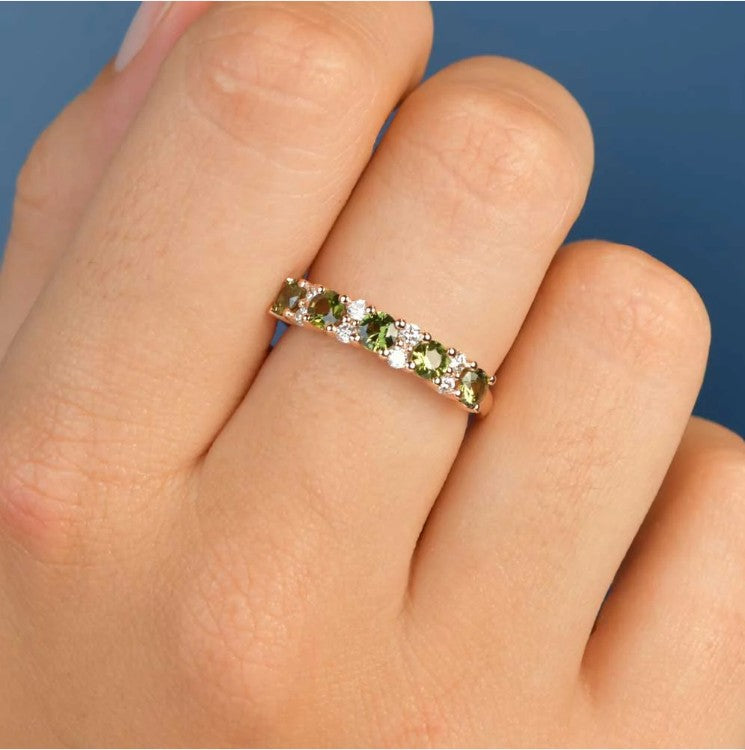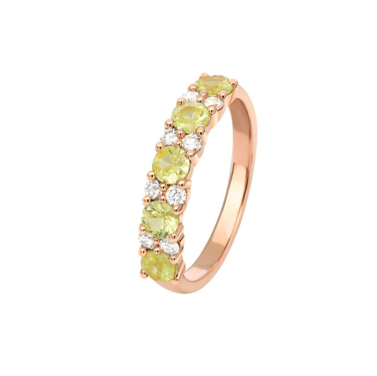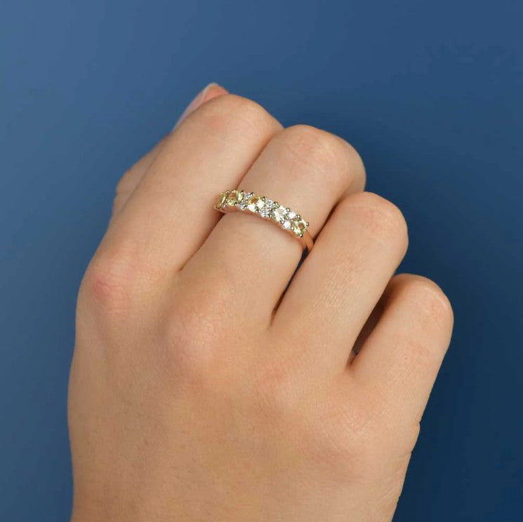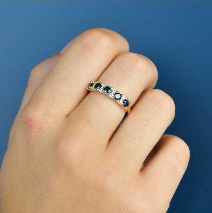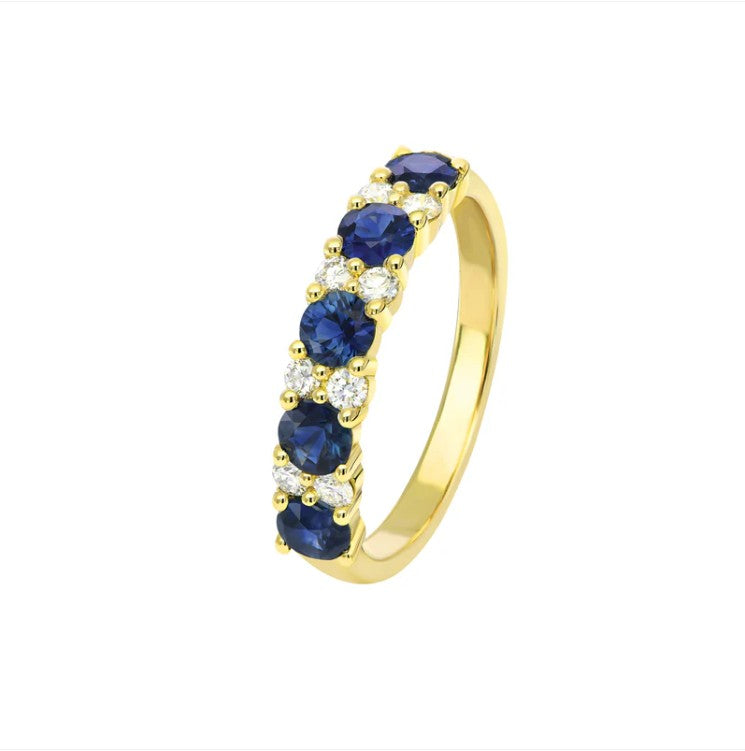 Kaia sapphire and diamond ring showcases 5 beautiful, vibrant round cut parti sapphires, with pairs of sparkling white diamonds nestled between each sapphire. This piece is luxurious and timeless, crafted in either 18ct yellow, white or rose gold.